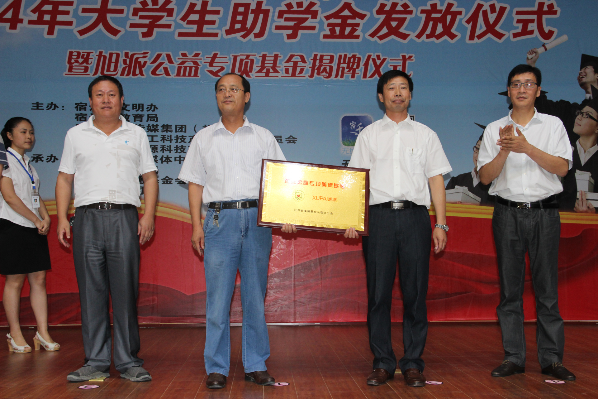 致辭過后,市委宣傳部副部長葉峰與旭派能源總經(jīng)理張文泉先生為旭派公益專項基金成立揭牌,然后發(fā)放助學金。學生代表也發(fā)表重要講話,感謝旭派能源公司的慷慨之舉,對他們的大學夢想的大力支持表示衷心的感謝,并表示會在大學好好學習,早日成為棟梁之才,回歸社會為人民造福。